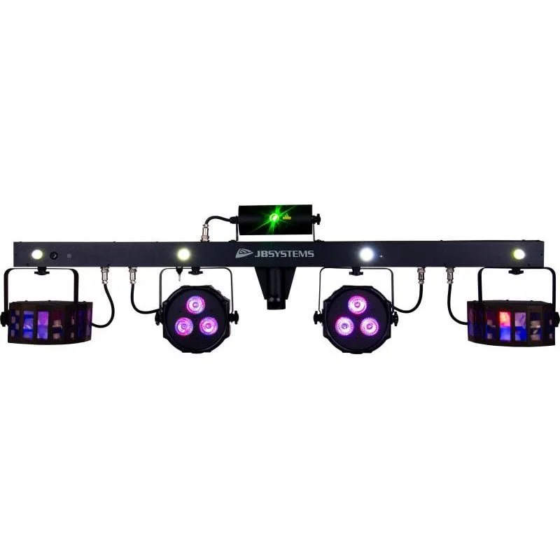 Met deze Party Bar van JB Systems krijgt u ieder feest aan de gang. De Party Bar is een vier-in-één LED-lichteffectenset, en niet zomaar één. Het lichtstatief is uitgerust met twee roterende derby-effecten met 3W RGB LED's, twee projectors met 3 x 9W RGB LED's met een stralingshoek van 15 graden, vier koud witte strobes/blinders en zelfs een twee-kleuren rood, groene laser.